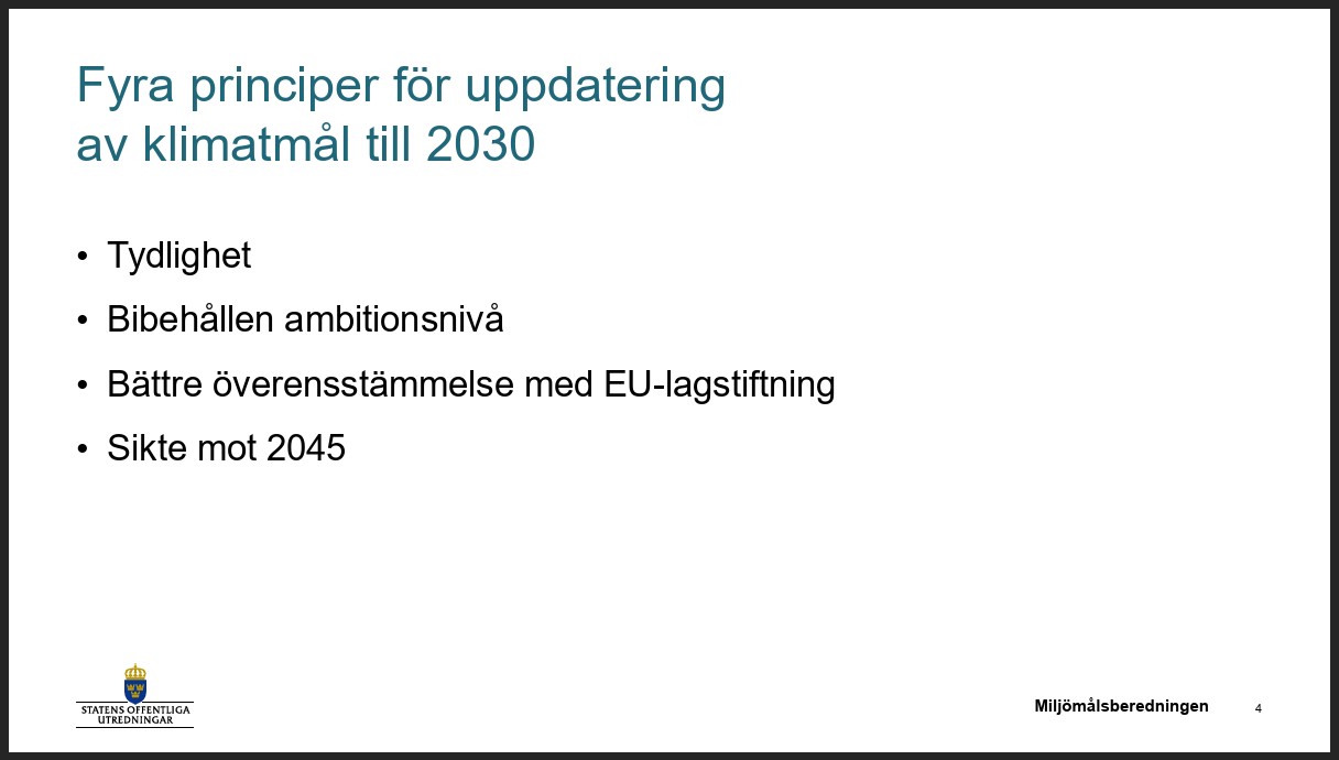 Det övergripande klimatmålet är att Sverige inte ska ha några nettoutsläpp av växthusgaser senast år 2045. Ett etappmål är att utsläppen 2030 bör vara 63 procent lägre än 1990 års nivå.