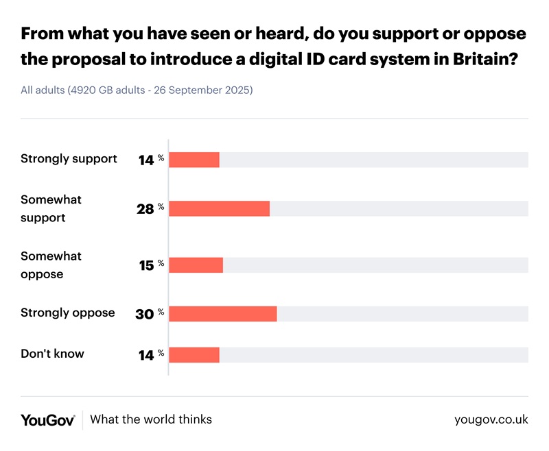 I en undersökning uppger 45 procent att de är emot digitala id-kort medan 42 procent är för. Ytterligare 14 procent har ingen åsikt.