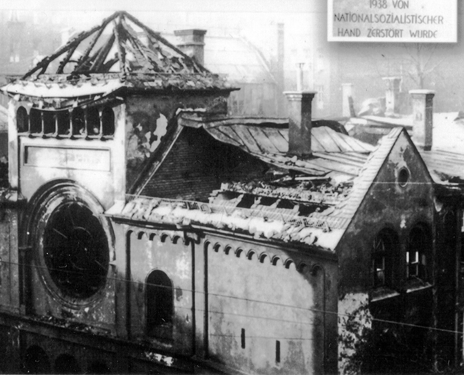 Förstörd synagoga under ”novemberpogromerna”. Bild: Okänd.