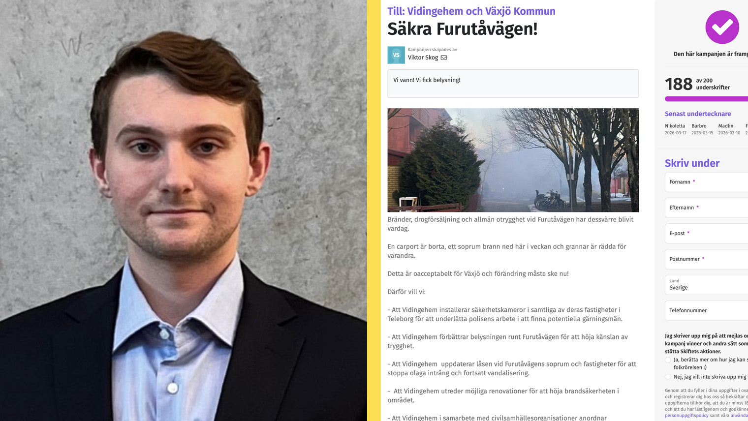 Det är mot denna bakgrund som 26-årige Viktor Skog trätt fram som en av de mest synliga rösterna från området i ett försök att få politikerna att reagera. I rapportering från andra medier har han beskrivit hur boende på Furutåvägen tröttnat på brända bilar, gäng som säljer narkotika och belysning som inte fungerar.