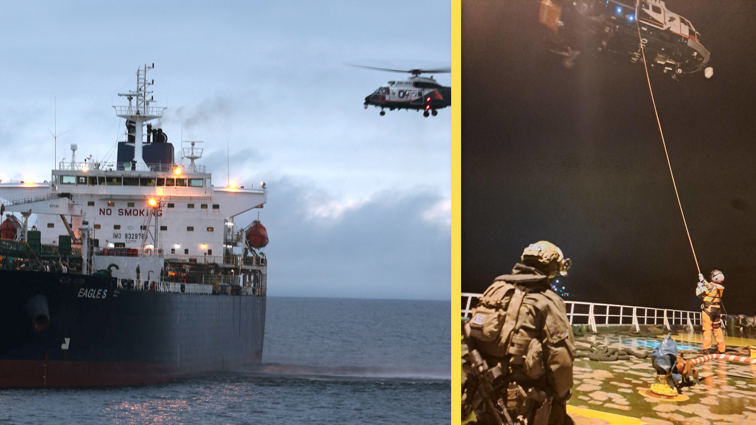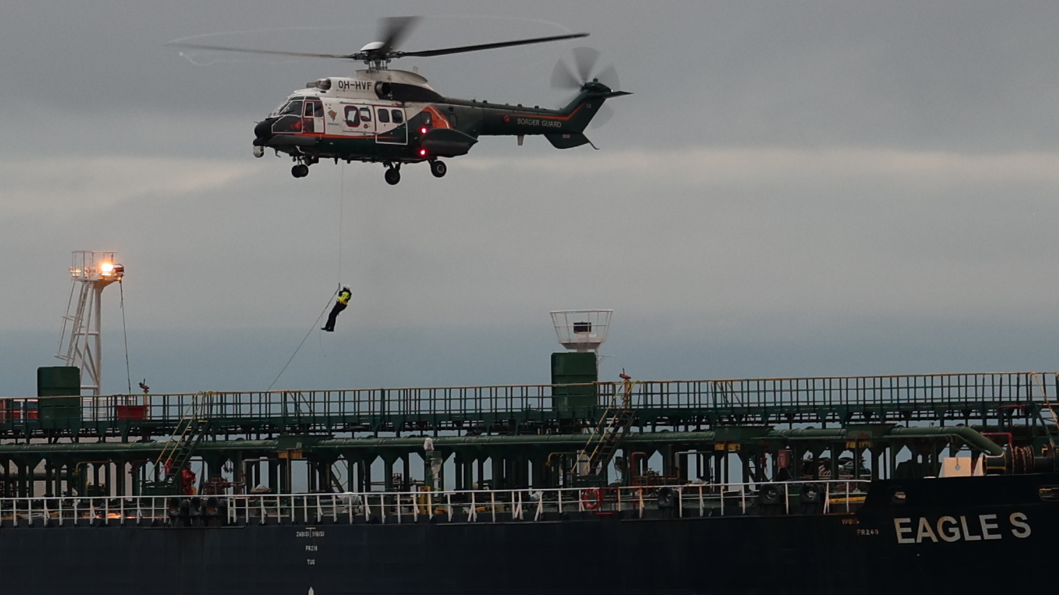 Där bordas tankfartyget under spektakulära omständigheter av finska specialpoliser som firar ned sig till det från en helikopter.