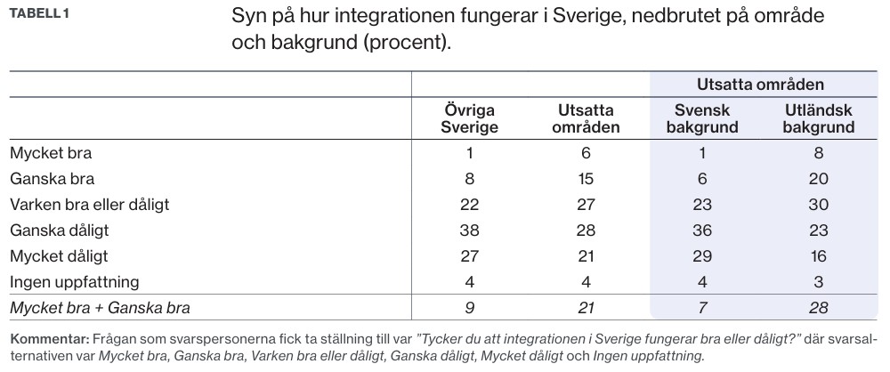 Vid nedbrytning på födelseland i utsatta områden kan man se att missnöje med samhällsutvecklingen har nämnts av betydligt fler födda i Sverige (52 procent) jämfört med de som är födda utanför Europa (29 procent). Bland boende i utsatta områden som är födda utanför Europa är det i stället höga skatter som har nämnts av högst andel inom gruppen.