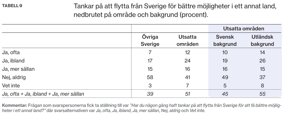I utsatta områden uppger 51 procent att de haft tankar om att lämna Sverige och tittar man enbart på de med utländsk bakgrund i utsatta områden stiger siffran ytterligare något, till 55 procent. I övriga Sverige ligger motsvarande andel på 39 procent.