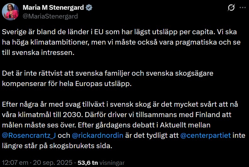 Ytterligare en dimension i miljöfrågan som man antingen missat eller inte låtsas om är att Sverige redan är klimatneutralt. Enligt ny statistik från Naturvårdsverket ökade den svenska skogens upptag av koldioxid 2024 med åtta miljoner ton jämfört med 2023.