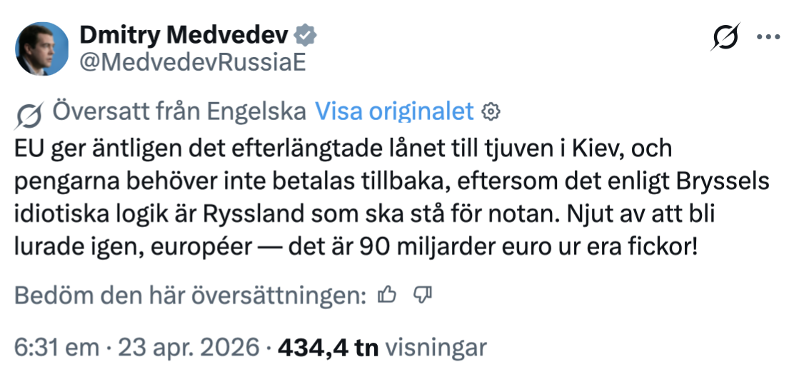 Den förutsättningen avvisas dock från rysk sida på torsdagen. Den tidigare ryske presidenten Dmitrij Medvedev, i dag vice ordförande i säkerhetsrådet och fortsatt en nära medarbetare till Vladimir Putin, har i ett inlägg på X, tidigare Twitter, meddelat att EU-länderna har gjort en felaktig bedömning och att Ryssland aldrig kommer att acceptera eller betala sådana krav.