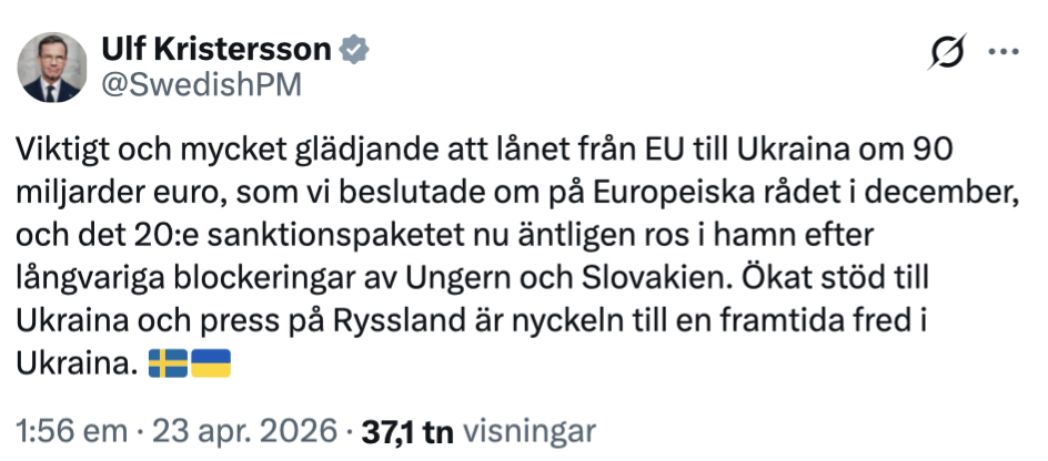 Kristersson framhåller i sitt inlägg att det omfattande stödet, där EU:s skattebetalare garanterar ett lån på omkring 1 000 miljarder kronor, utgör en ”nyckel till en framtida fred i Ukraina”. Samtidigt väcks en naturlig fråga om vad som händer om även dessa medel förbrukas innan en fredsuppgörelse har nåtts – och hur många liknande stödpaket som i så fall kan komma att krävas framöver.