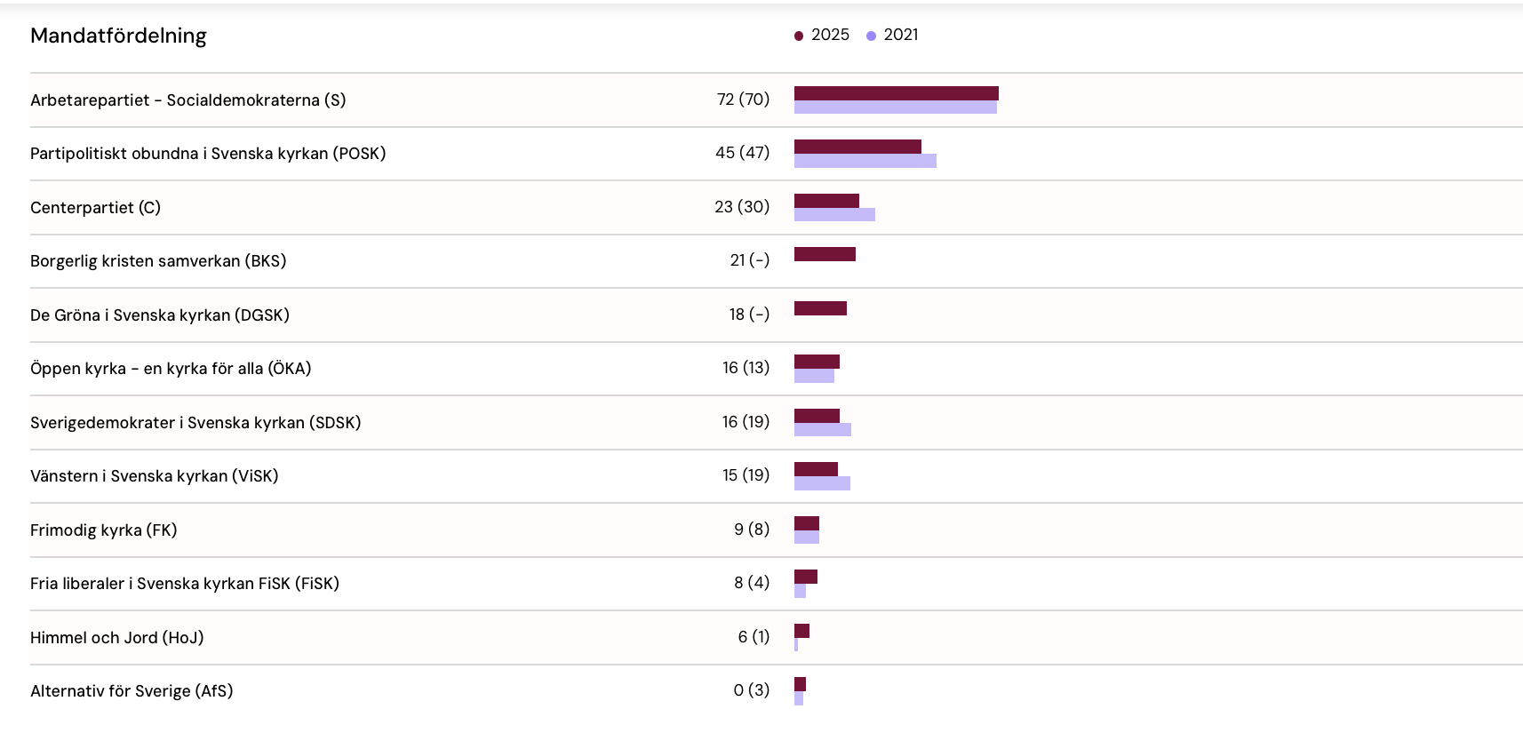 De följs av Partipolitiskt obundna i Svenska kyrkan (POSK), Centerpartiet, Borgerlig kristen samverkan, De Gröna i Svenska kyrkan, Öppen kyrka – en kyrka för alla. Först därefter Sverigedemokraterna – som dessutom tappat tre mandat i kyrkomötet.