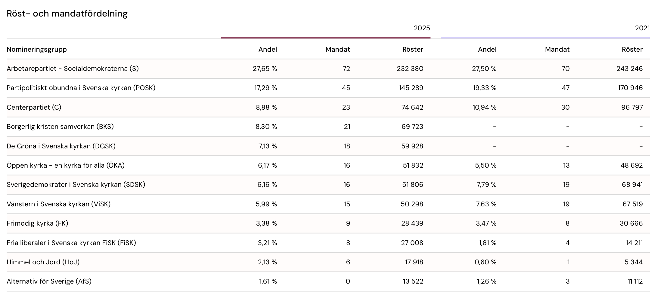 Med 2 083 av 2 085 valdistrikt och över 840 000 röstade räknade står det klart att Socialdemokraterna blir största parti i kyrkomötet med 27,65 procent av rösterna, vilket ger 72 mandat.