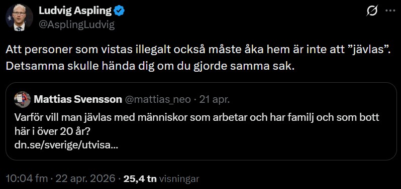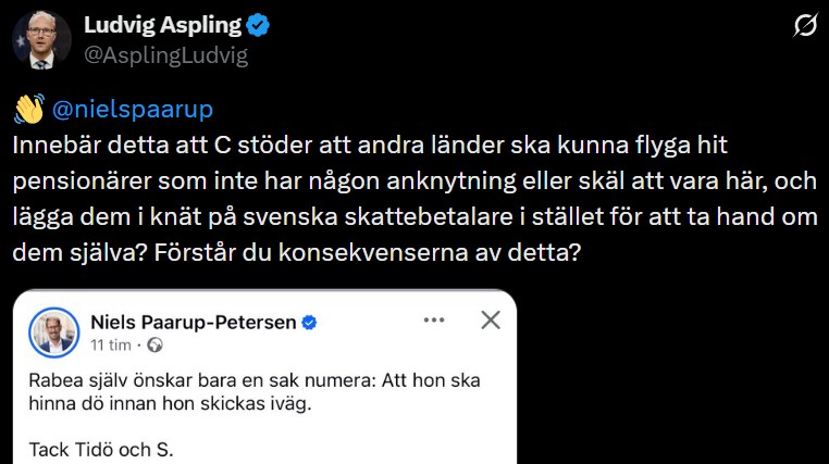 Ludvig Aspling är Sverigedemokraternas migrationspolitiske talesperson och har i flera inlägg på X kommenterat fallet. Han konstaterar bland annat att det rör sig om en person som befinner sig i Sverige illegalt och kostar de svenska skattebetalarna stora summor: