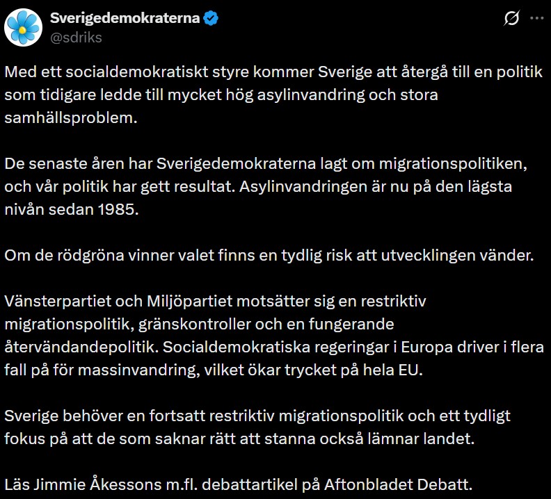 I en debattartikel varnar Åkesson tillsammans med Ulf Kristersson, Ebba Busch och Simona Mohamsson för att en rödgrön regering skulle öppna för en återgång till den gamla katastrofala invandringspolitiken igen.
