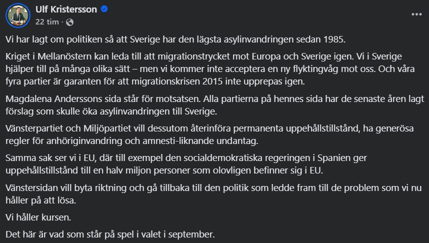 Inför valet pågår just nu en intensiv kampanj mot den normalisering av invandringspolitiken som regeringen och Sverigedemokraterna genomfört där man på vänsterkanten vill tillbaka till öppna gränser igen. Efter protester mot de så kallade tonårsutvisningarna är taktiken nu att fokusera på och blåsa upp enskilda fall. Samtidigt varnar både Jimmie Åkesson och Ulf Kristersson för vad en rödgrön vinst i höst kan innebära.
