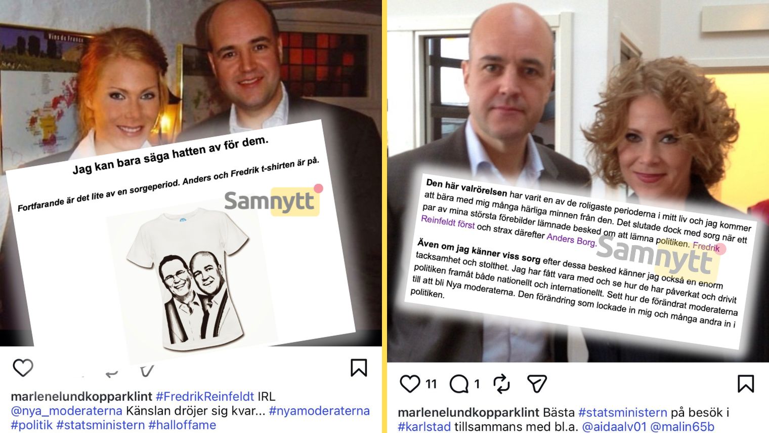 I ett inlägg på sin blogg skriver Marléne Lund Kopparklint att hon befinner sig i ”en sorgeperiod” och visar en t-shirt med den tidigare statsministern och M-ledaren Fredrik Reinfeldt, som hon menar bär ett stort ansvar för den massinvandring som har påverkat Sverige. Samtidigt markerar hon sin personliga sorg över att Reinfeldts tid som partiledare är över genom att bära t-shirten.