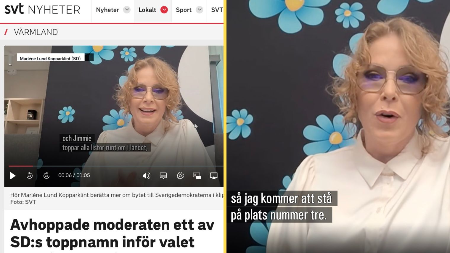 – Jag hoppade av listorna i Värmland redan i november och jag tycker att det är viktigt att ha en plattform att jobba med de frågor jag brinner för. Sverigedemokraterna har bra plattformar. Jag byter inte värderingar, utan jag byter bara verktyg och går till ett parti som vill driva frågor framåt, säger Marléne Lund Kopparklint i en intervju med Riks.