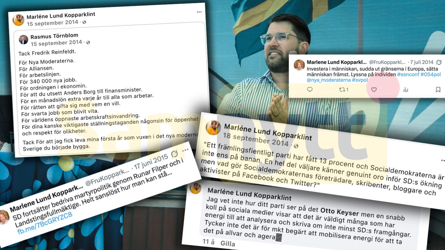 Montage av Samnytt. Axplock av inlägg från SD:s nya toppkandidat. Foto: SD / Faksimil Facebook / X