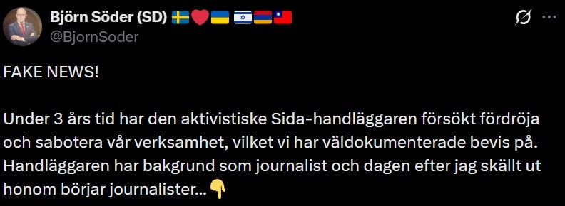 ”Fake news” ryter Söder till på sociala medier och utvecklar sitt resonemang mer i detalj och avslöjar hur det faktiskt gått till. Där skriver han att den aktivistiske Sida-handläggaren under tre års tid gjort sitt yttersta för att fördröja och sabotera Hepaticas verksamhet, något man har väldokumenterade bevis på.