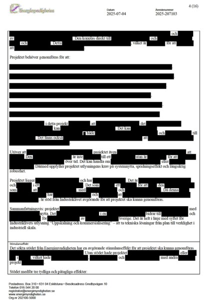 Då företaget redan lever på bidrag från myndigheten är det med en ändring i tidigare beslut man äskar mer pengar – även här mörkas dokumentationen så att i princip ingenting går att urskilja.