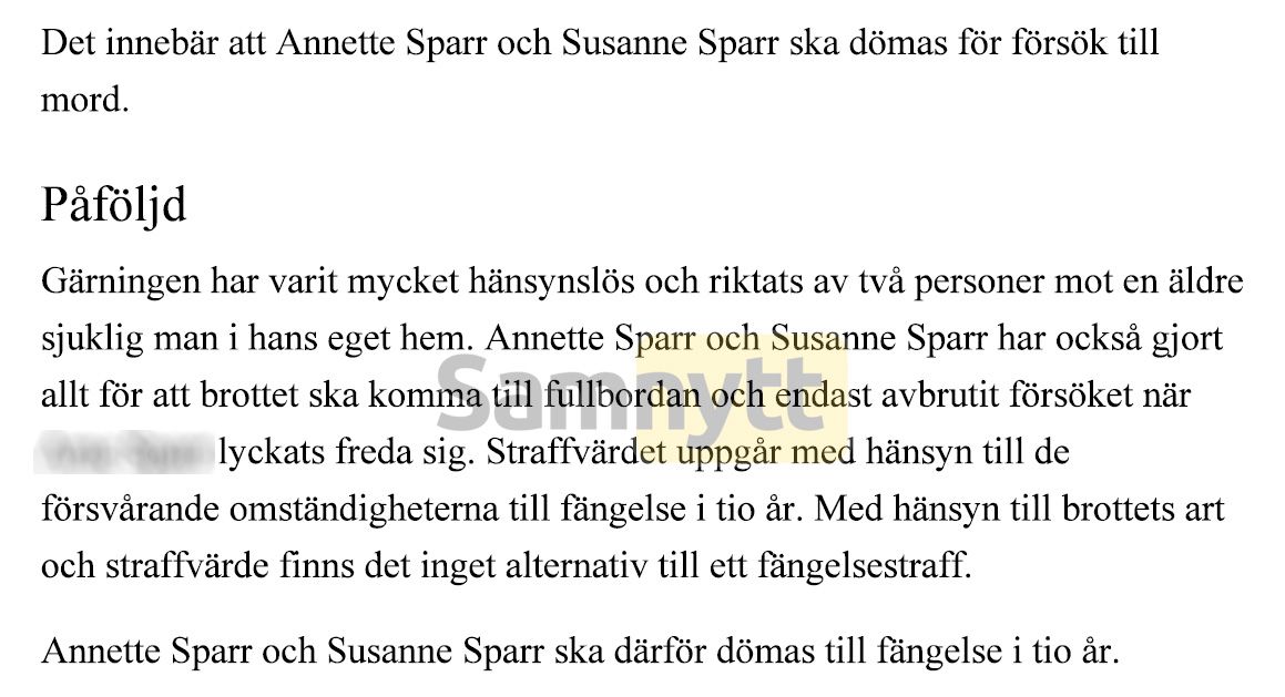 Båda systrarna – Annette Sparr, född 1961-06-12, och Susanne Sparr, född 1965-02-16 – döms därför för försök till mord. Påföljden bestäms till tio års fängelse vardera.