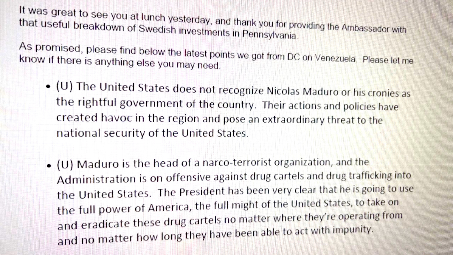 Samnytt har tagit del av amerikanska ambassadens mejl till den svenska regeringen. Av mejlet framgår att USA kommer använda ”alla tillgängliga medel” för att skära av Venezuelas regeringen. Och det innehåller även uppmaningar till den svenska regeringen om att delta i åtgärderna mot det sydamerikanska landet.