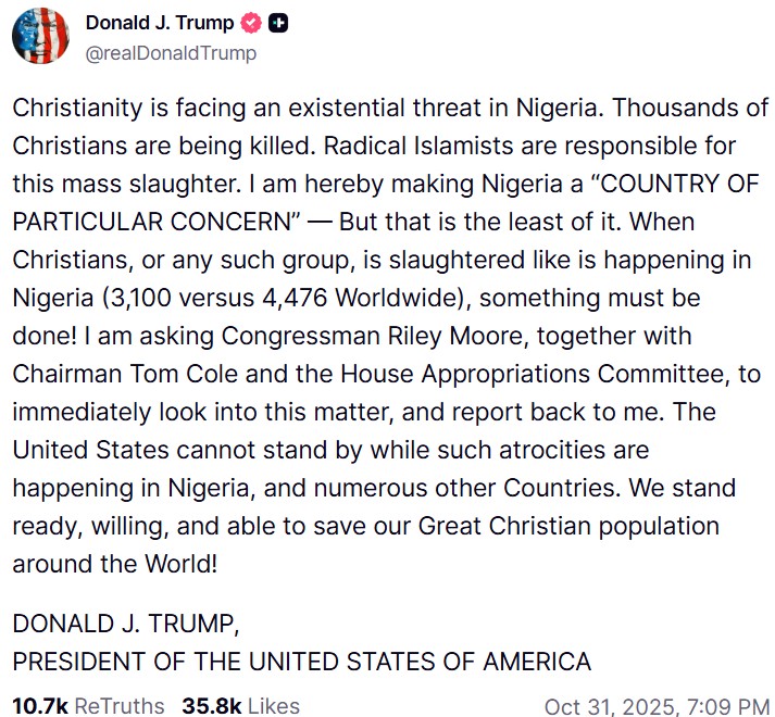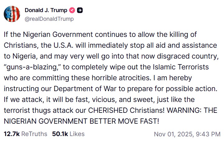 Redan i fredags skrev Trump i ett inlägg på Truth Social om att kristendomen är utsatt för ett existentiellt hot i Nigeria och att man nu placerat landet på en lista över länder som väcker oro samt att man är redo att försvara kristna över hela världen: